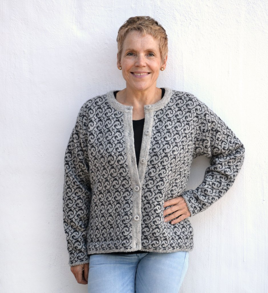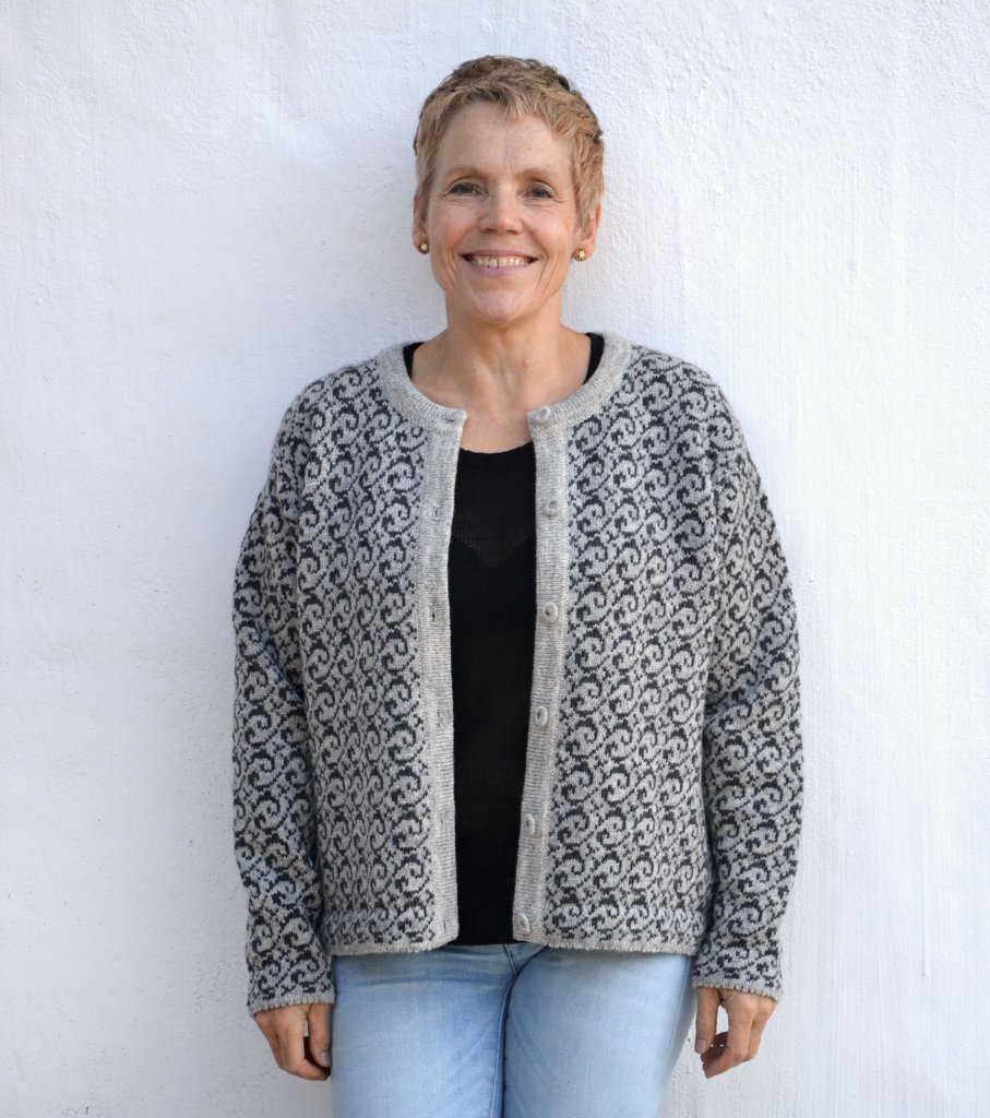 Kofta i en kort modell med garnknappar och ett mönster vi kallar akleja.