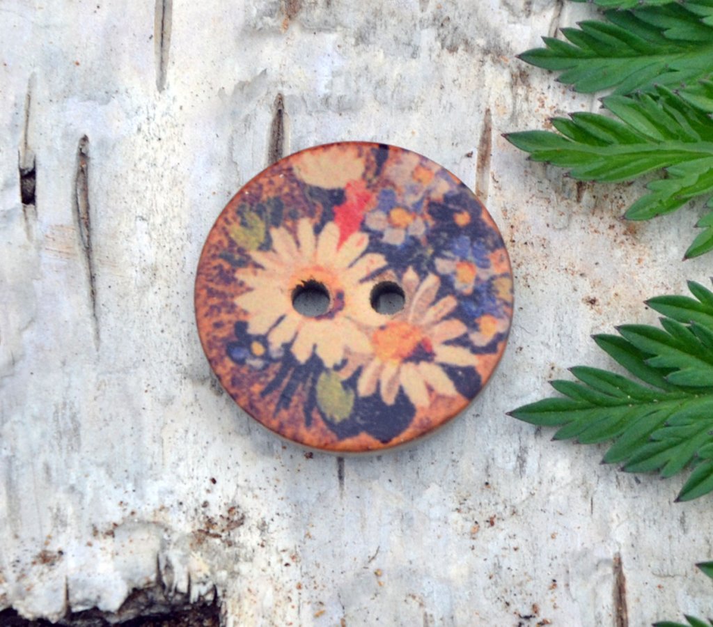 Knapp av kokosnöt med dekorativt blomtryck. 22 mm 2 hål