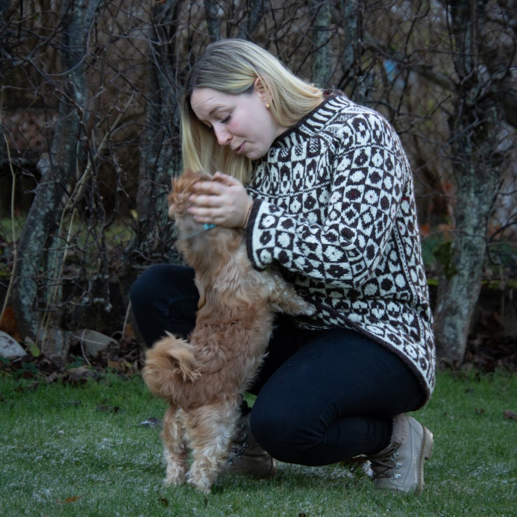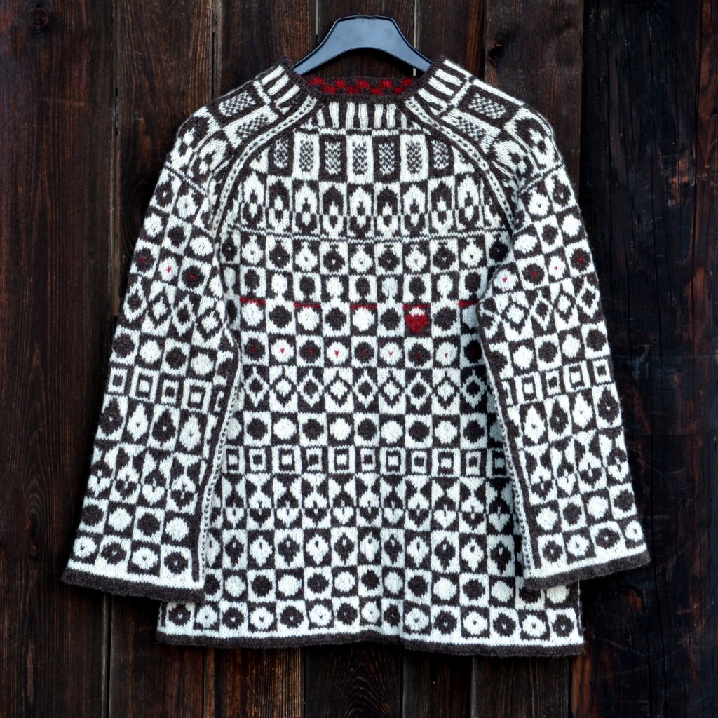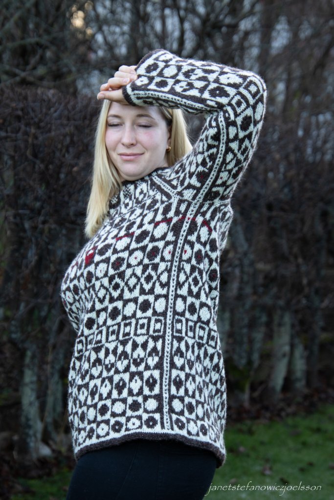 Tröjan har A-form och är stickad nerifrån.