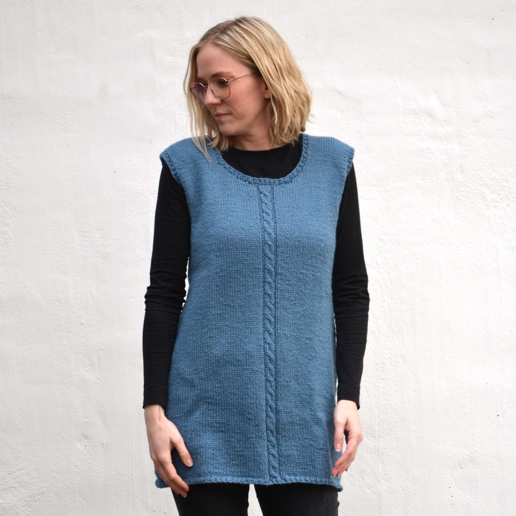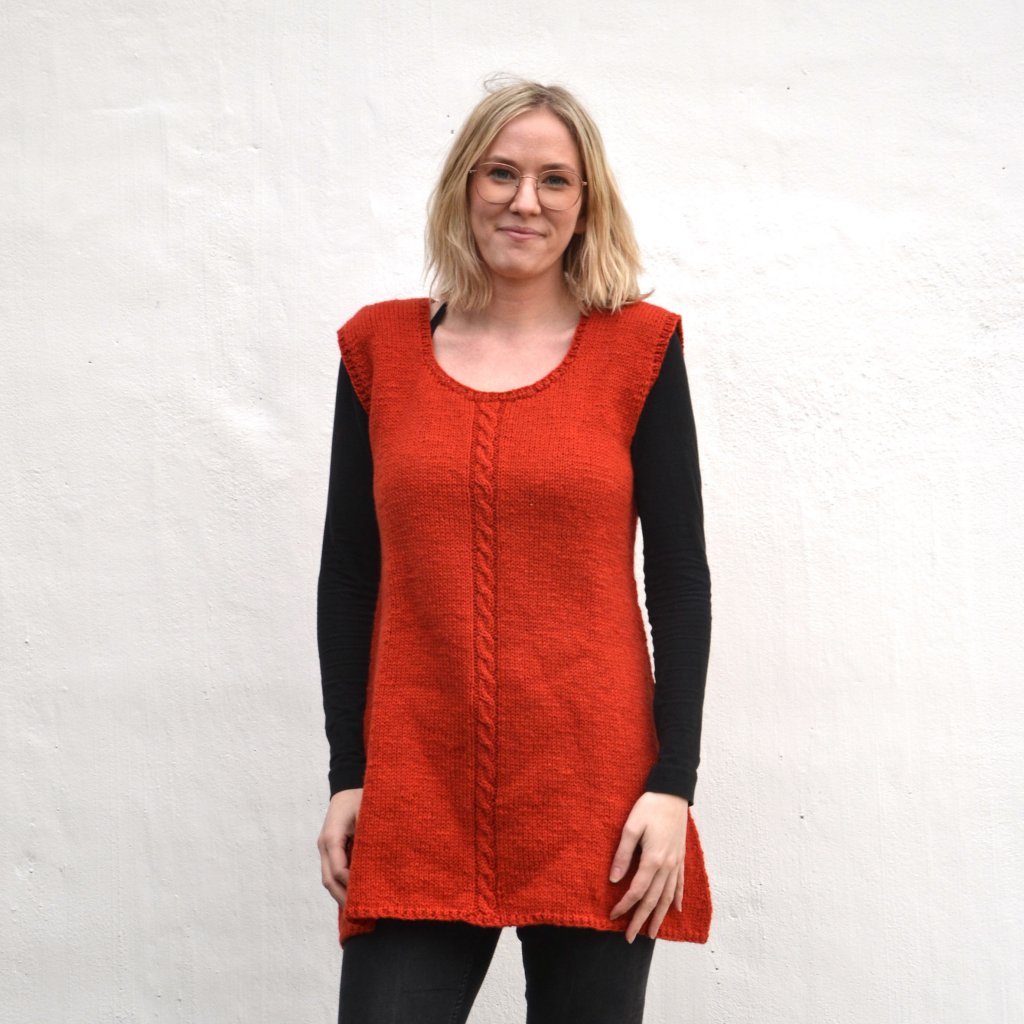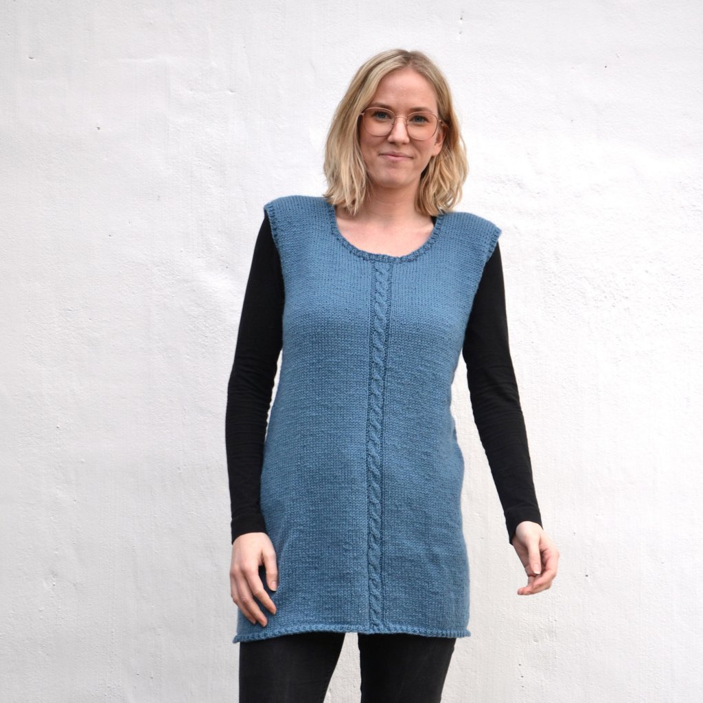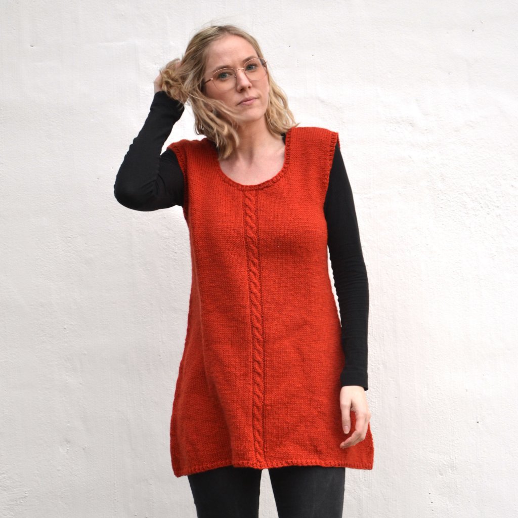 Tunikorna på bilderna är stickade i färger: petrol och tegel